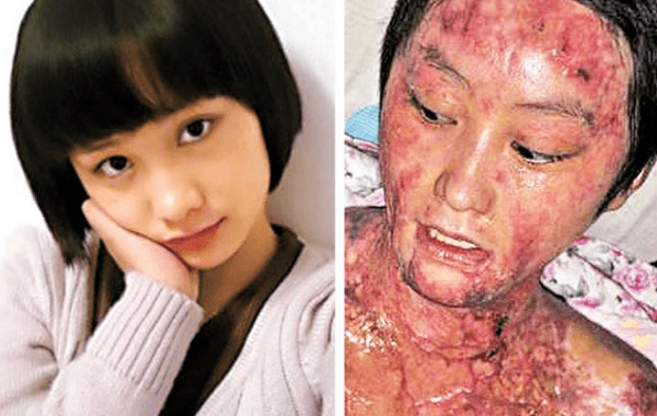 上图这个女孩,原本娇美的容貌被彻底毁掉了,满脸满身的疤痕,触目惊心。