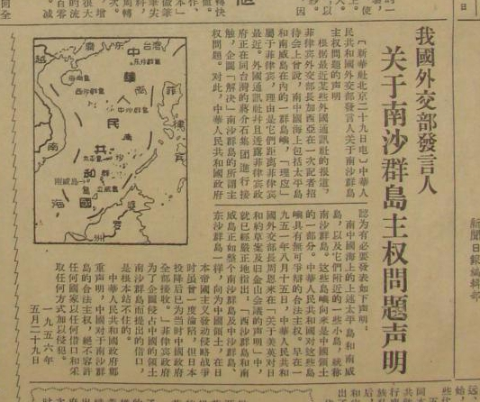 1956年5月29日,中国外交部发言人发表声明:南沙群岛向来是中国领土的一部分。中国外交部发言人针对菲律宾外交部长说“南中国海上包括太平岛和南威岛在内的一群岛屿‘理应’属于菲律宾”的话,发表声明说:南沙群岛向来是中国领土的一部分。