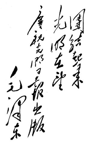 毛泽东为庆祝光明日报出版题词:团结起来,光明在望。