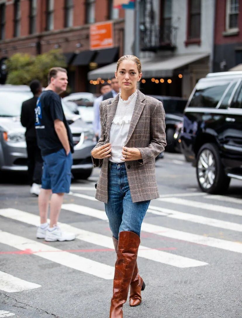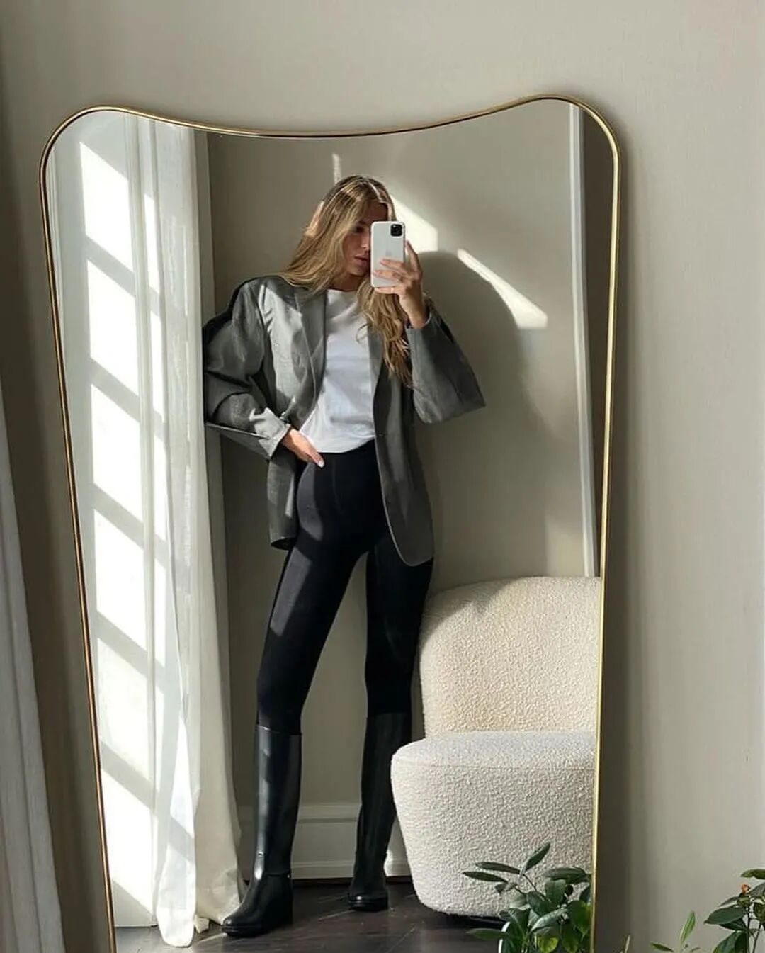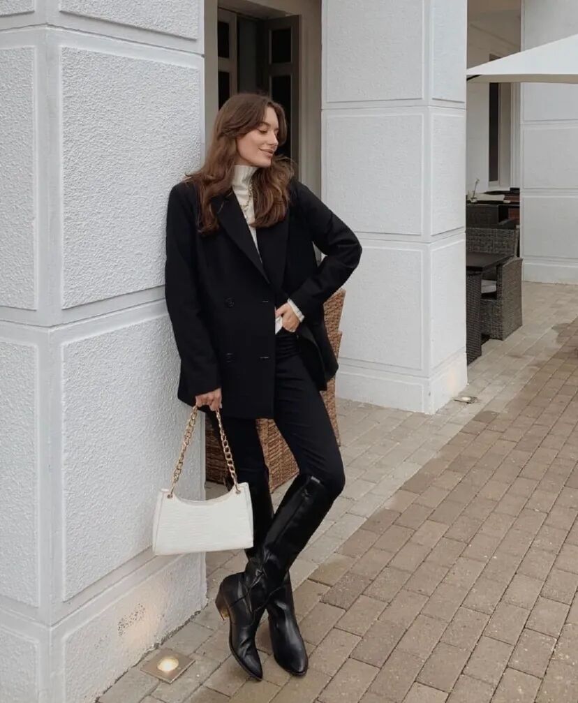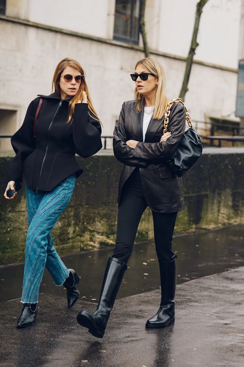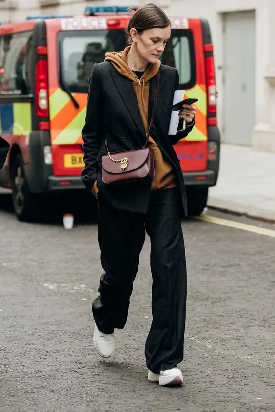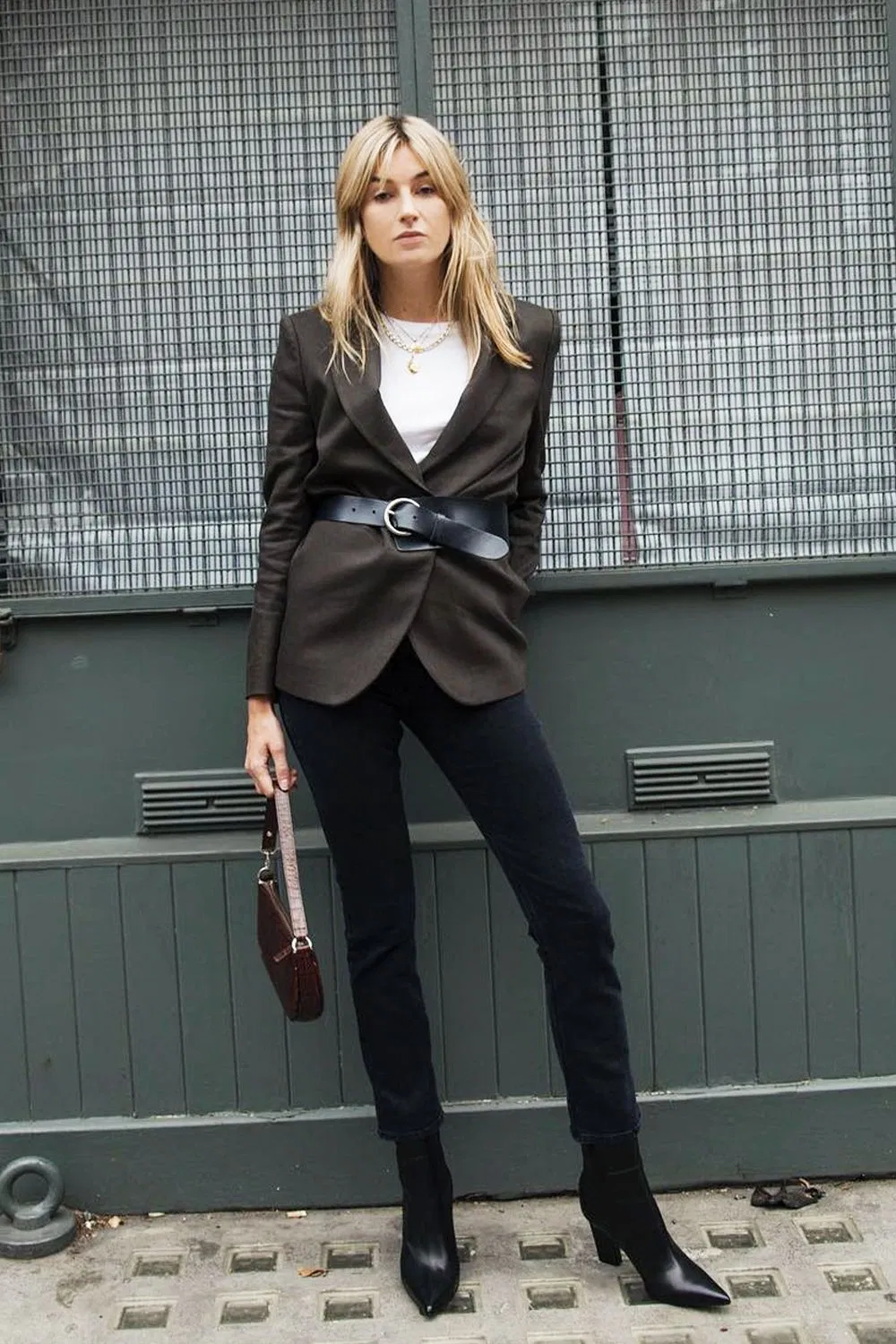 腰带粗细不同,风格也不同。粗一点的更霸气,细一点的更优雅。街拍里最多的还是粗一点的款式,2cm以上的都可以。像BV出的这种细的不多见。▼这组搭配我也非常喜欢,不仅超帅气,而且黑裤子加黑长靴,真·显高又显瘦。长靴里今年最流行的是骑士靴,是靴子里的帅气担当。▼骑士靴其实对腿型不算很友好,容易显腿弯。不过都换成黑色,就没那么明显啦,腿粗、腿弯都能驾驭这个组合。上半身西装和毛衣都选中性色,整体会更简洁帅气。▼掌握这个公式,改变上装和毛衣,可以变化出N个造型。看看法国博主Lucie Mahe的穿搭实践。▼除了骑士靴,其他黑长靴也可以试试的,只是风格气质没有那么酷了。过膝靴会更性感、更显利落,尖头高跟靴则更大女人风。▼还记得前不久说的自带Boylish(小男孩)感的“Fudge风”女孩吗,她们也很喜欢用这组公式。▼很多欧美小花们也喜欢这样穿,比如Kaia Geiber。她这两件西装款式其实都有点容易老气,加了连帽卫衣后更有活力。▼西装外套一定会比卫衣要长,这样比例才能优化。如果是哈比人,里面的卫衣可以选短款,或者扎进里面,一长一短才能有层次感~▼因为卫衣比较厚,搭配的西装也要选宽松一点的。否则上半身会看起来鼓鼓的。▼这两年很流行的西装套装,里面也可以搭连帽卫衣,整体从很正式一下子变得很有街头感,更适合日常出街穿。鞋子也可以换成更休闲的帆布鞋或者老爹鞋。▼下面这两组适合北方地区的同学,当温度到了个位数,西装最好换成毛呢面料的,更加温暖~