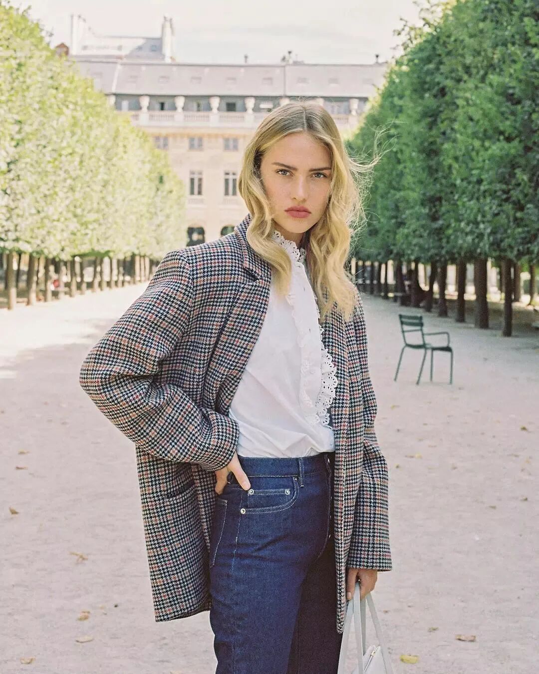 这组搭配复古又随性,也是非常经典的法式穿搭。Jeanne Damas就很喜欢这样穿▼这个组合我自己也穿过N次了,各种西装外套都可以套用。宫廷风衬衫的选择空间也很大,太复杂、立体的款式容易显得上半身很壮,对胸大星人尤其不友好。做内搭我还是更建议选简洁款,带一点宫廷风设计的就好。▼如果你那里已经开始要穿毛衣了,也可以直接在衬衫外套一件圆领毛衣哦,只要露出宫廷风衬衫的花边领做点缀就很好看了。法式风代表Jane Birkin这套经典造型用的就是这个思路。▼