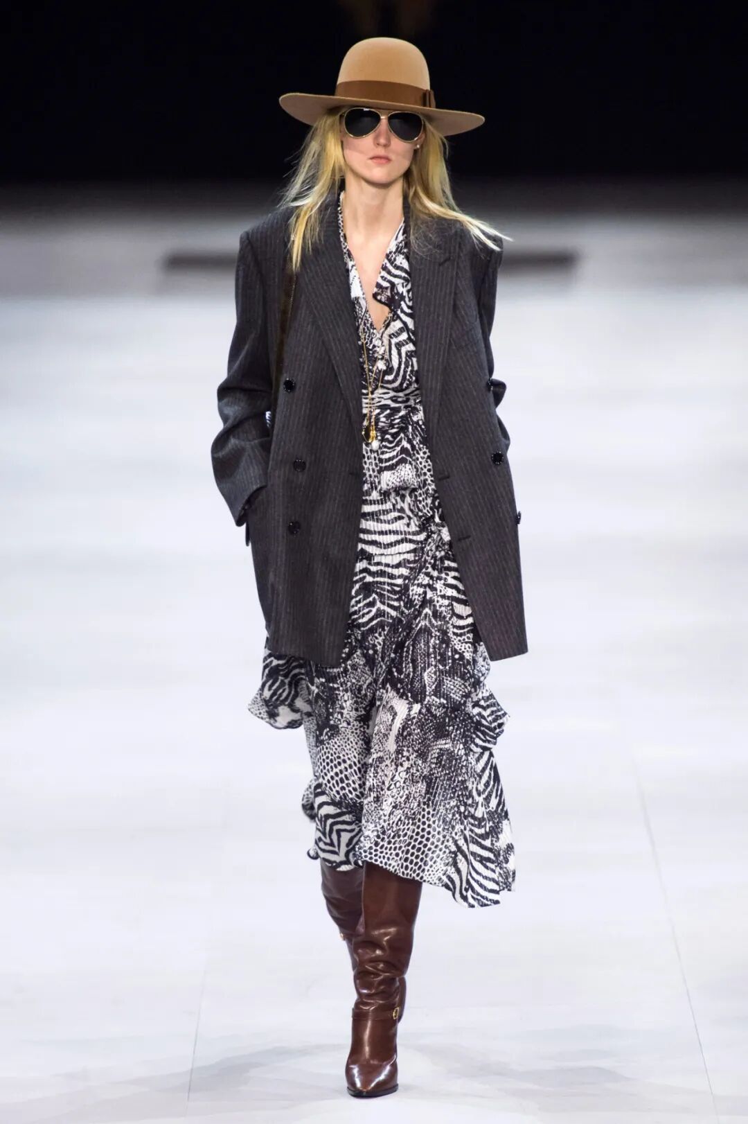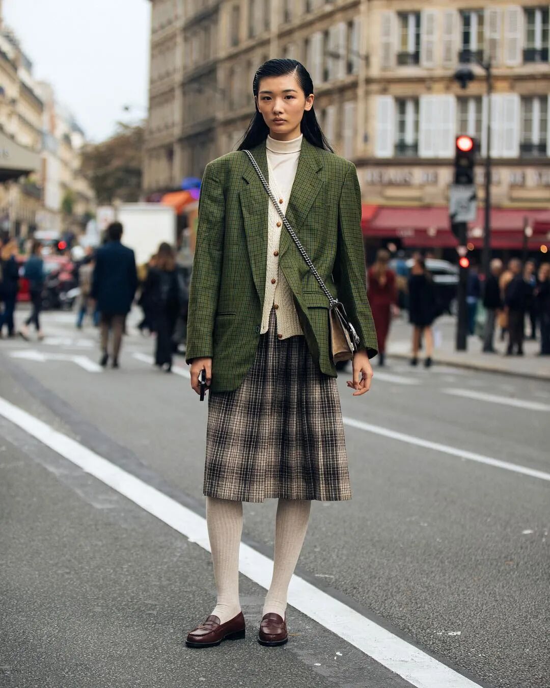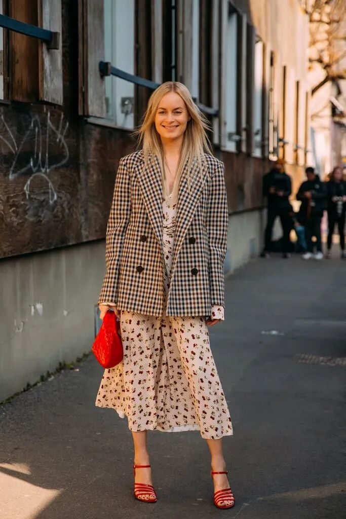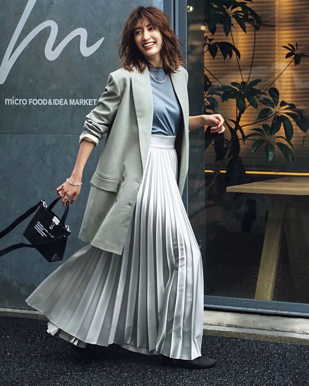 博主 Lendra Medine这张更是艺高人胆大,内搭的领子设计更夸张,很绝!不过这种会更适合长脖子星人。▼前段时间去拍东山口老洋房视频(没看的同学记得去微博看看哈),就穿了西装加印花裙,广州这样穿的季节还蛮多的!印花裙活泼,西装正式,两者搭配在一起也非常和谐,还能多一份风情。既然印花裙已经很花了,西装就选纯色的吧~▼现在这个季节,其实搭靴子会更好,一方面能增加酷感,另一方面也更温暖一些。这样搭同事不会再问你“穿裙子冷不冷”了哈哈▼这两年很流行搭配长靴,很多同学会觉得这样搭配比较臃肿,其实做好平衡就好。像Celine这套就很好看,选的是比较轻薄的裙子,另外还搭了个帽子,整体很有七十年代风情。靴子里面还可以藏厚裤袜,再冷一点也能穿~▼二十几度的天气,还很适合穿西装+半裙。其中我又最推荐西装搭配百褶裙。百褶裙的裙褶设计自带立体感,相比其他半裙,穿起来会更灵动,也更有活力。▼百褶裙不是容易显胯宽嘛,选长一点的西装还可以遮胯,完美避开百褶裙这一缺点,梨形身材赶快学起来~▼