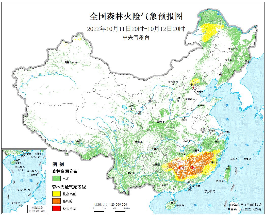预计,2022年10月11日20时至10月12日20时,北京北部、河北北部、内蒙古东北部、黑龙江西部、浙江南部、福建大部、江西中南部、湖南中南部、广东北部、广西东北部、贵州东南部、新疆北部等地的森林火险气象等级较高,其中,福建西部、江西中南部、湖南南部、广东北部、广西东北部等地的部分地区森林火险气象等级高,江西西南部、湖南南部等地的局部地区森林火险气象等级极高。请各有关单位严加防范,严禁一切林内用火,确保林区安全。