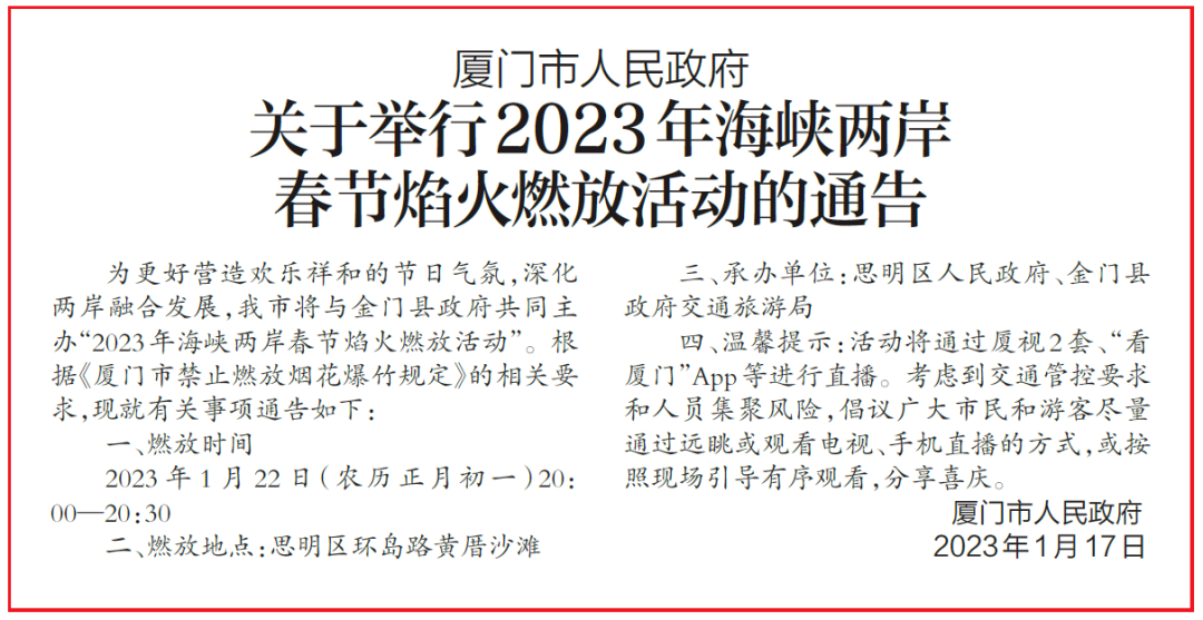 为更好营造欢乐祥和的节日气氛,深化两岸融合发展,我市将与金门县政府共同主办“2023年海峡两岸春节焰火燃放活动”。根据《厦门市禁止燃放烟花爆竹的规定》的相关要求,现就有关事项通告如下: