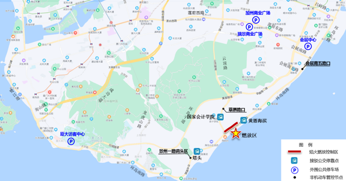 确需自己驾车前往观看焰火的市民朋友,建议将车辆停放至厦大访客中心、会展中心、瑞景商业广场、加州商业广场等管制区外围停车场,再乘坐公共交通或步行进入管制区域。