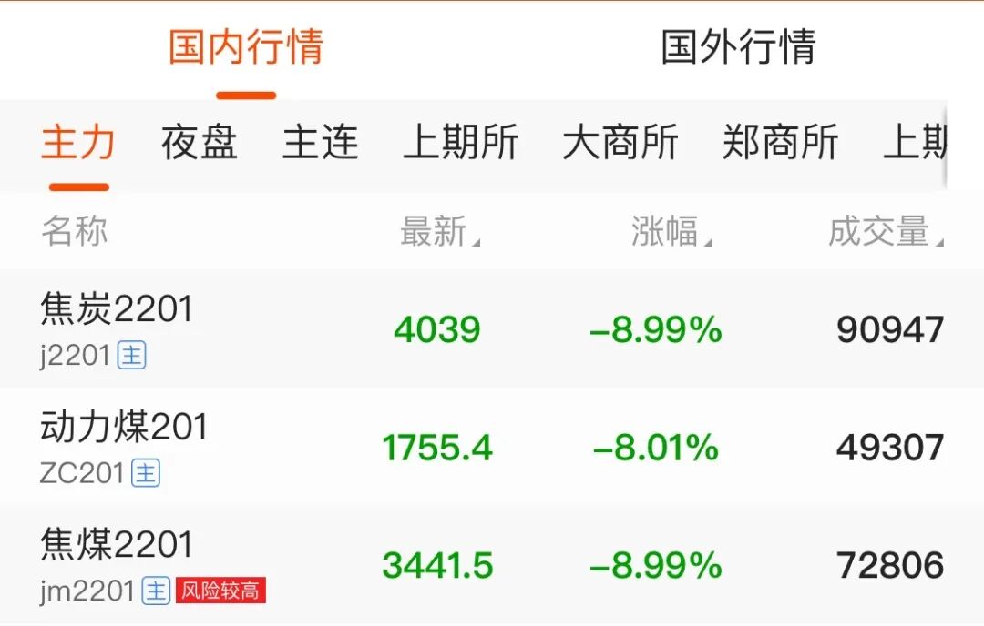 具体来看,焦炭主力合约跌8.99%,报4039元;焦煤跌8.99%,报3441.5元;动力煤下跌8.01%,报1755.4元。