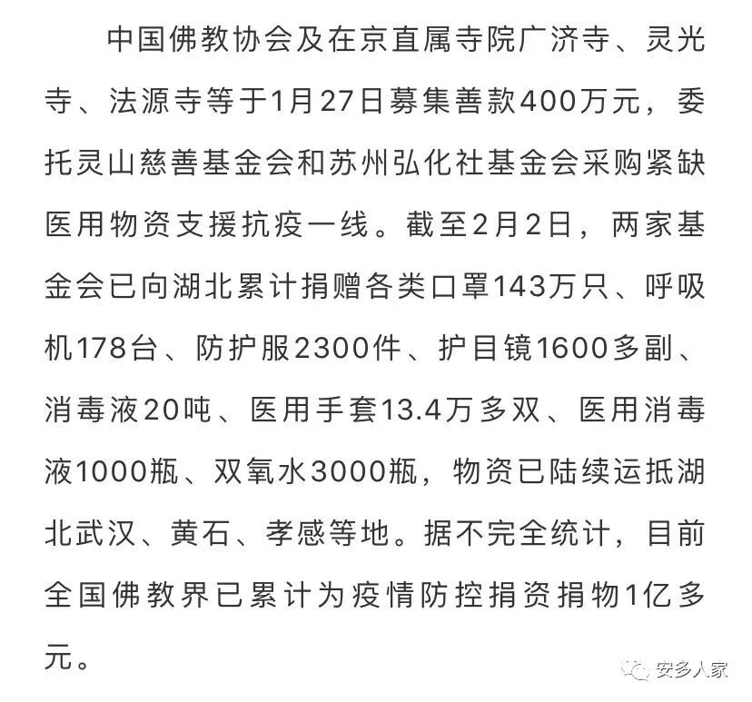自年初新冠肺炎爆发以来,宗教界慈悲大爱,心念仓生,在诵经祈福的同时,纷纷慷慨解囊,援助武汉。截至目前,根据国家宗教事务局“微言宗教”发布:全国佛教界已累计捐助1亿多元全国道教界已累计捐助3900多万元全国基督教界已累计捐助1100多万元全国天主教界已累计捐助550多万元中国伊斯兰教协会已累计捐助50万元