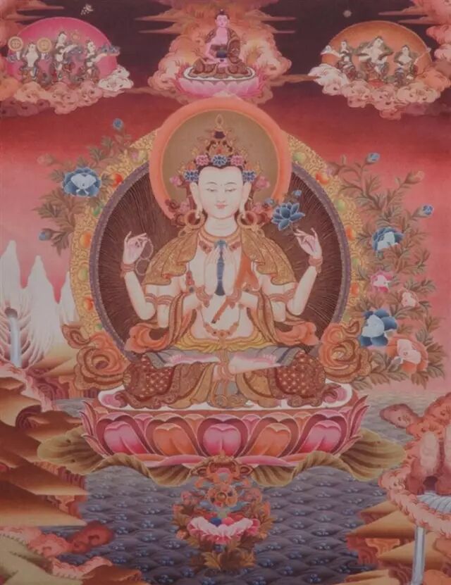 莲花上如来对观自在菩萨说:“善男子!请为我宣说这六字大明咒王,我是为了无数百千万俱胝那庾多有情,让他们远离轮回苦恼,速疾证得无上菩提。”
