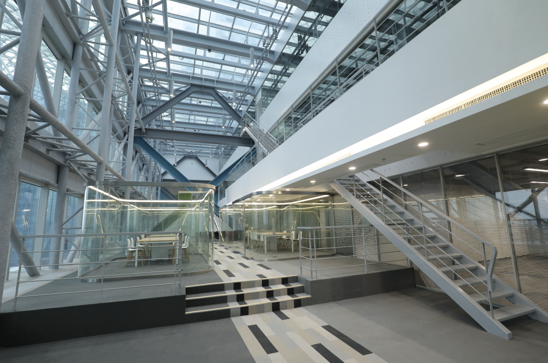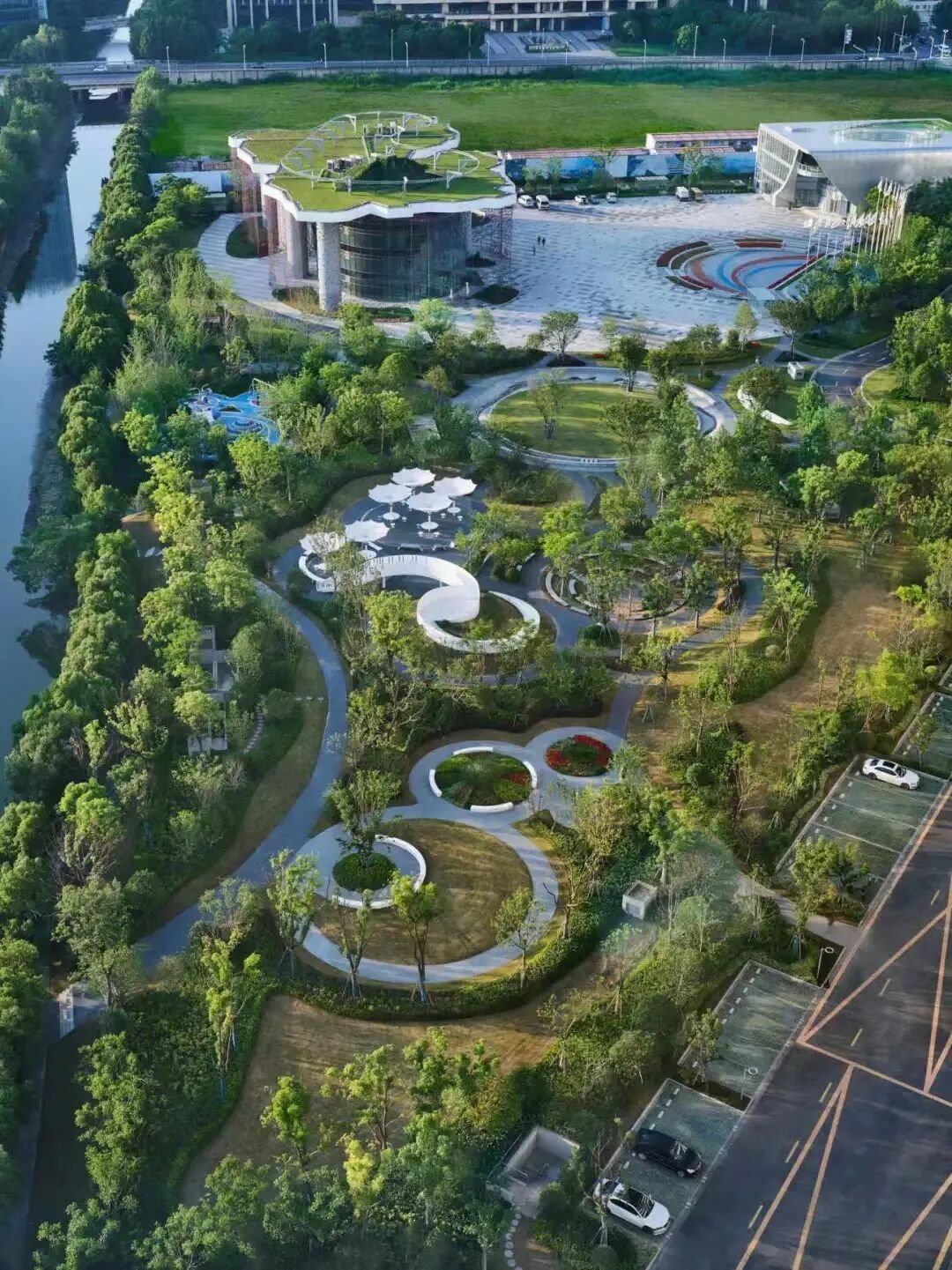云廊不仅有商业配套、办公楼宇,还藏着一个世博公园。有两座曾经的世博场馆“搬迁”到了这里,它们都是用原材料复建的。