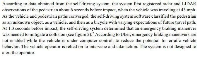 除了这份报告中明显提到的总体系统设计失败外,令人吃惊的是,系统花了好几秒的时间来确定看到的前方到底是什么(无论是行人、自行车、汽车还是其他什么),而不是这种情形下做出唯一的合理决定,从而旨在确保没有撞上。这有几个原因:第一,人们常常会事后会用言语表达其决定。