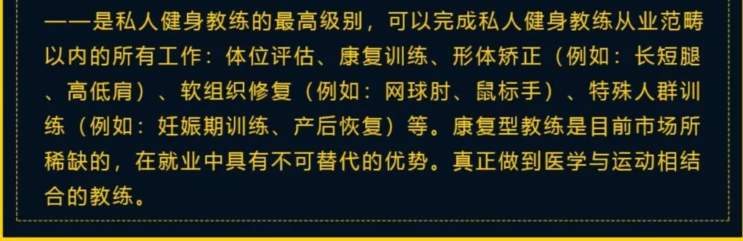 比如,在部分培训机构中「康复训练私人教练」这一职业称谓,被归为私人健身教练的最高级别,在机构的具体介绍中,「康复训练私人教练」可以完成体位评估、康复训练、形体矫正、软组织修复、特殊人群训练等内容。