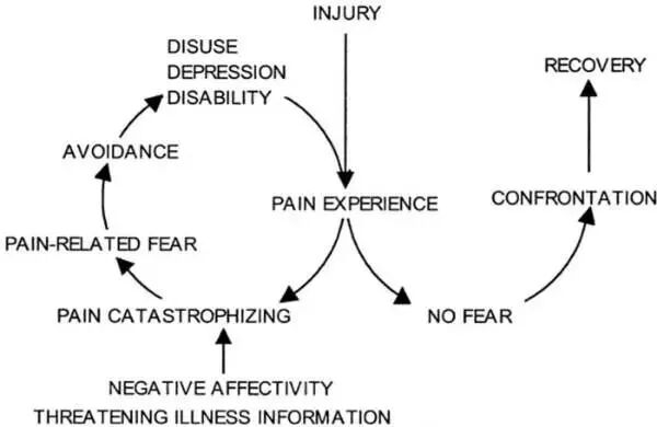 除了物理疼痛以外,Fear-avoidance model很大程度阐明了,心理病也会导致物理病。这类患者没有功能障碍,却因心理认知问题,导致功能障碍的恶性循环,因此通常采用渐进性运动疗法,向患者证明并无障碍。