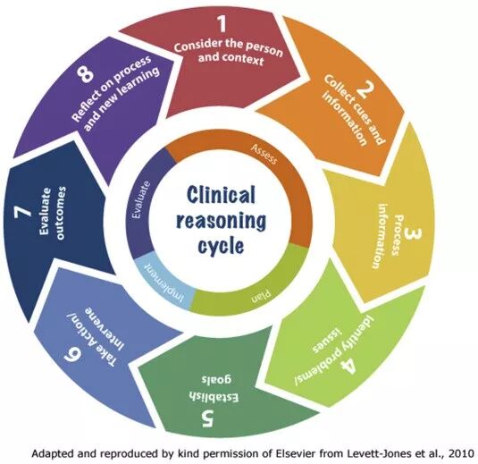 在临床推理中常用的Clinical Reasoning Cycle,就包含了「评估假设」、「计划制定」、「治疗实施」、「再次评估」,物理治疗师往往要对实际执行中的线索,进行解读,以不断更新迭代诊疗计划。