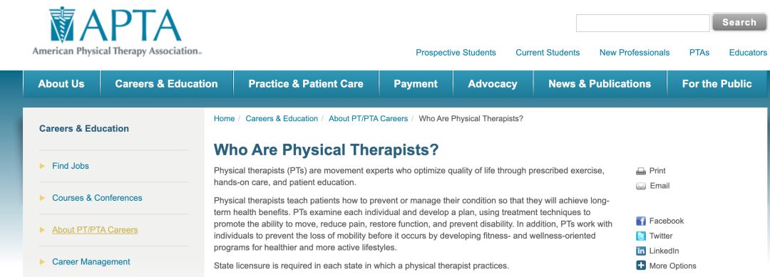 什么是物理治疗师?根据美国物理治疗协会APTA的定义,物理治疗师,是一种通过徒手、仪器、运动治疗,来改善患者的身体疼痛、功能受限的医疗职业。
