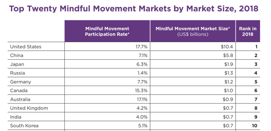 根据GWI 2019年的报告,包括瑜伽在内的静态运动,全球国家/区域市场规模中,美国已经达到17.7%的渗透率排在首位。中国以7.1%的静态运动渗透率位列之后,但58亿美元的总规模排在全球第一。