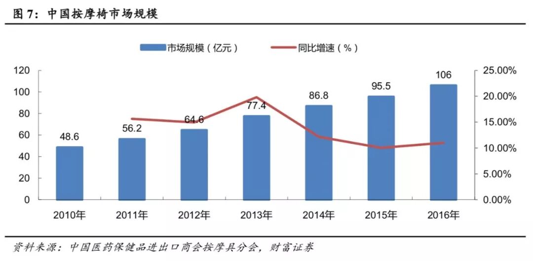 比如,财富证券曾指出,国内按摩器具的市场规模在逐年上升,2010 年至 2016 年,按摩椅市场规模从 48.6 亿元增长至 106 亿元,复合增长率为 13.88%