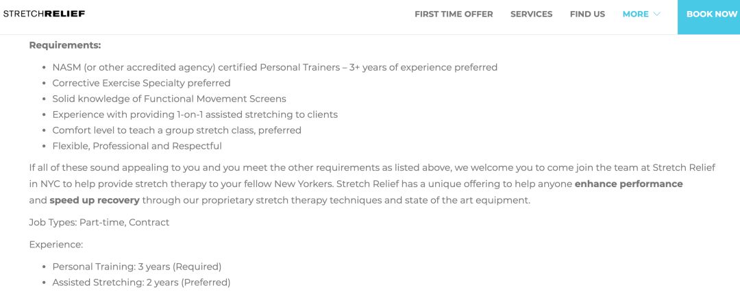 Stretch Relief要求招聘教练必须具备NASM等认证,三年实操经验,对于CES等矫正运动认证优先,甚至Stretch Lab的招聘栏中,需要物理治疗dpt的职业执照证明。