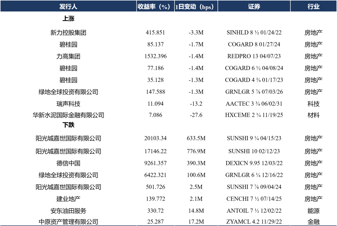 行业方面,科技、材料块领涨,房地产、金融板块领跌。科技板块主要受瑞声科技等名字上涨的影响,收益率下行约3.2bps;材料块主要受华新水泥国际金融有限公司等名字上涨的影响,收益率下行约15.7bps;房地产板块主要受阳光城嘉世国际有限公司、德信中国等名字下跌的影响,收益率上行约4.8Mbps;金融板块主要受中原资产管理有限公司等名字下跌的影响,收益率上行2.5Mbps左右。