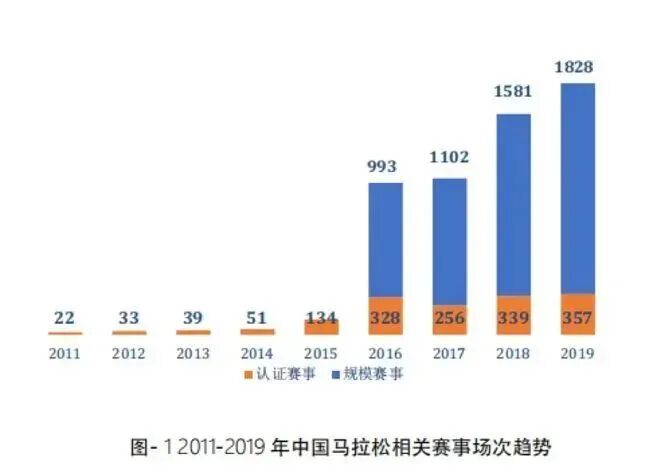 中国田径协会公布数据显示,2011年,全国马拉松及相关路跑赛事数量仅为22场,但到了2019年,这个数字增长到了1828场——