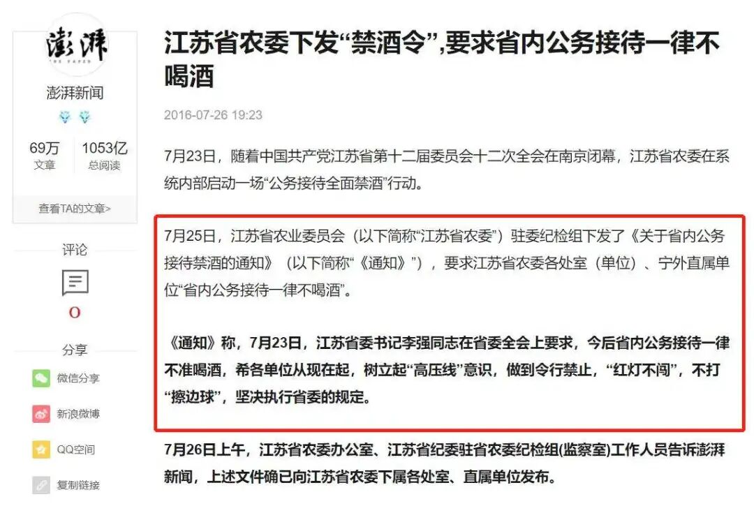 再比如,据澎湃新闻报道,2016年7月25日,江苏省农业委员会面向江苏省全体公务员下发了《关于省内公务接待禁酒的通知》,要求“省内公务接待一律不喝酒”。《通知称》,该“禁酒令”为刚刚上任的大领导特意强调。