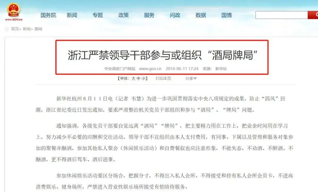 比如,2014年6月,浙江省发出通知,严禁领导干部参与或组织“酒局牌局”,要求各地各单位和各级党员干部做到省内公务活动一律不准提供各类烟酒。