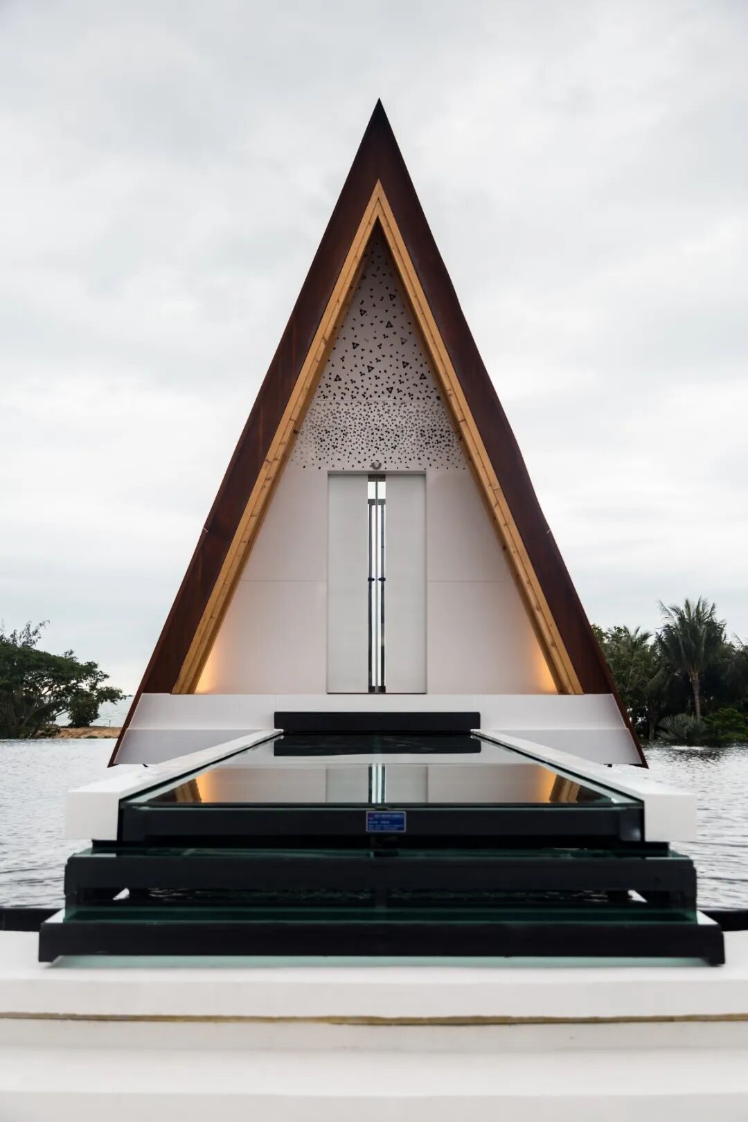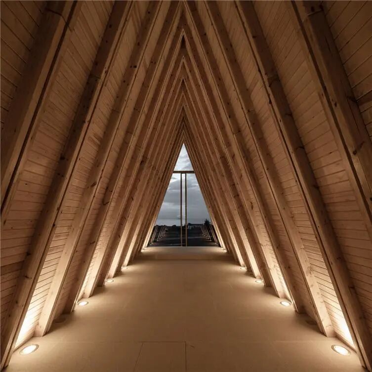 红白相间,白色为主的建筑中蒂西思礼堂最为惹眼,以三角几何形态中的力学稳定性与视觉平衡感,为它营造了一种永恒存在的精神氛围,在这里感受时间的缓慢流动。