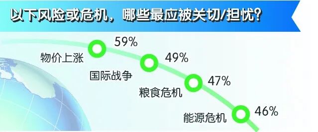 2022年,疫情、能源危机、通货膨胀等问题成为不少国家面临的挑战。在各类问题中,民众最关心的是什么?本次调查结果显示,在33国的受访者中,选择“物价上涨”的人比例最高,达到59%。“国际战争”“粮食危机”“能源危机”位列最受关注问题的第二梯队,分别占49%、47%和46%。此外,失业率、疫情和恐怖主义也成为部分国家民众最关切的问题。
