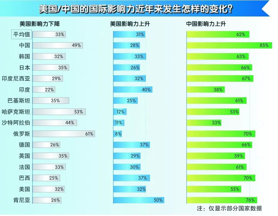 《环球时报》旗下环球舆情调查中心近期进行的33国民意调查显示,62%的受访者认为中国的国际影响力上升,而认为美国国际影响力上升的只有31%。