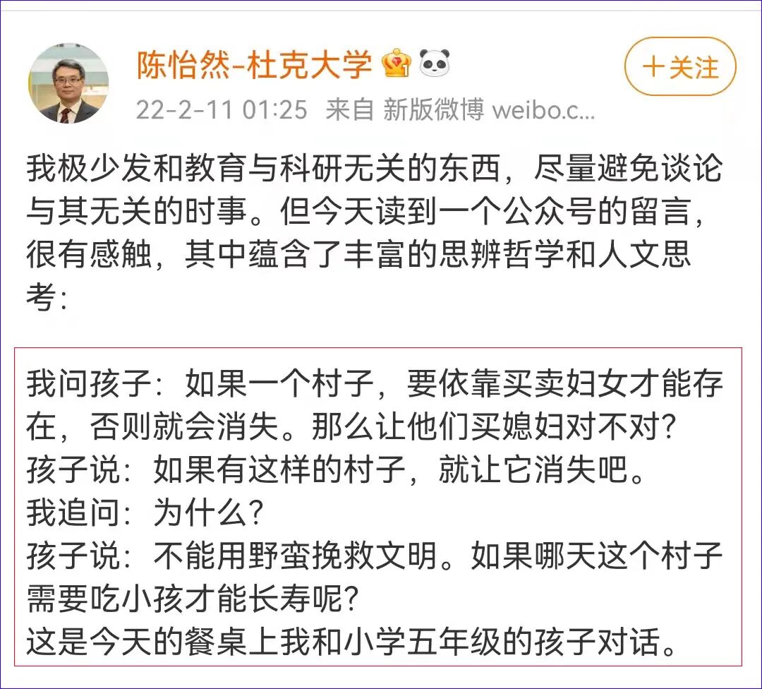 问:如果一个村子,要依靠买卖妇女才能存在,否则就会消失。那么让他们买媳妇对不对? 孩子:如果有这样的村子,就让它消失吧。 问:为什么? 孩子:不能用野蛮挽救文明。如果哪天这个村子需要吃小孩才能长寿呢?