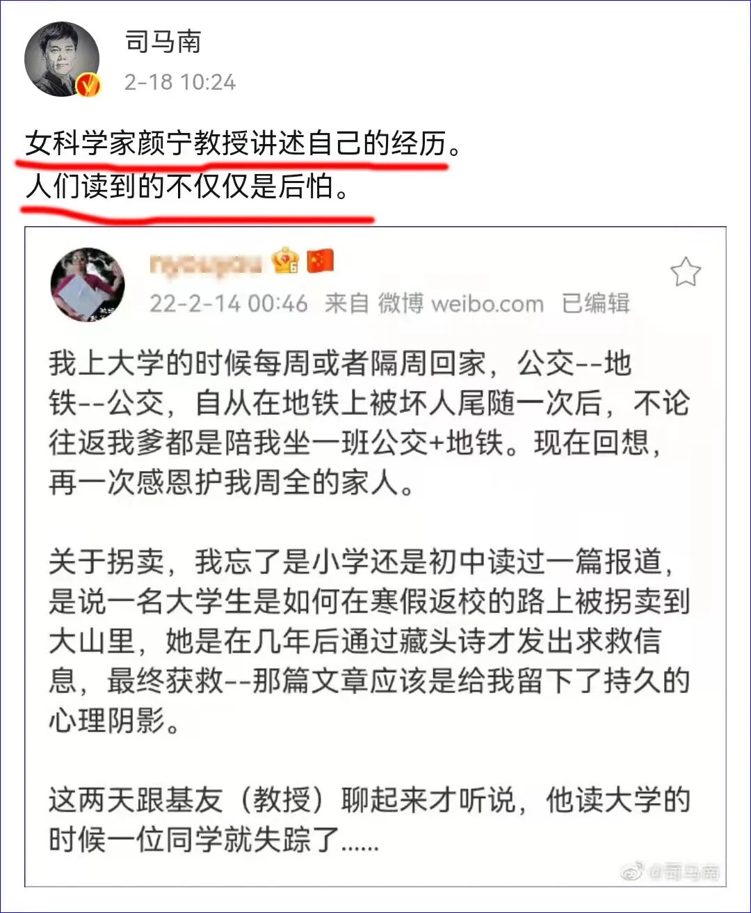 颜宁教授讲了自己的什么经历,让司马南老师要专门录一则视频来讲这个事情呢?2月14日,颜宁教授在微博上讲了一件很多年前的往事,上大学时曾在地铁上被坏人尾随过一次,从那次后,颜宁的父亲就不放心,每次颜宁回家时会接送(颜宁上大学时每周或隔周回家),陪颜宁坐地铁和公交。颜宁说,她回想起来,觉得很感恩家人。在这则微博中,颜宁还讲了很多年前她读过的一篇报道,和从朋友那里听来的一件事。这种心理阴影,和8个孩的母亲的事情,叠映在一起,不免引发人们更多的想法。