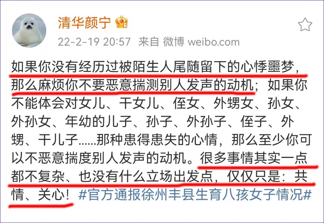 还有这位,说“大家太闲”,“闲得蛋疼”,把“屁事当大事”。一位同胞姐妹可能遭受过被拐卖,被拘禁等多种不幸,他说这是“屁事”?网友对这位同胞姐妹的关心,他说这是“闲得蛋疼”?颜宁教授多次说过,她只想搞科研之余,当一个轻轻松松的娱乐博主,无厘头博主。我想,她对“生育八孩女子事件”的关注,只是出于人性的善良,出于对一个命运多舛的女人的悲悯。但是网络上冒出来这么多无耻至极的声音,让我开始为颜宁教授有一种担心。他们在网上围殴过作家,围殴过大学教师,连治病救人的张文宏医生都不放过,这次会不会盯上颜宁教授了呢?被这帮网络喷子盯上,即使毫发无损,也终归是一件很恶心的事。事实是,已经有网络喷子开始咬上去了。今天(2月19日),颜宁教授发了一条微博:“如果你没有经历过被陌生人尾随的心悸噩梦,那么麻烦你不要恶意揣测别人发声的动机……很多事情其实一点都不复杂、也没有什么立场出发点,仅仅只是:共情、关心!”![]()