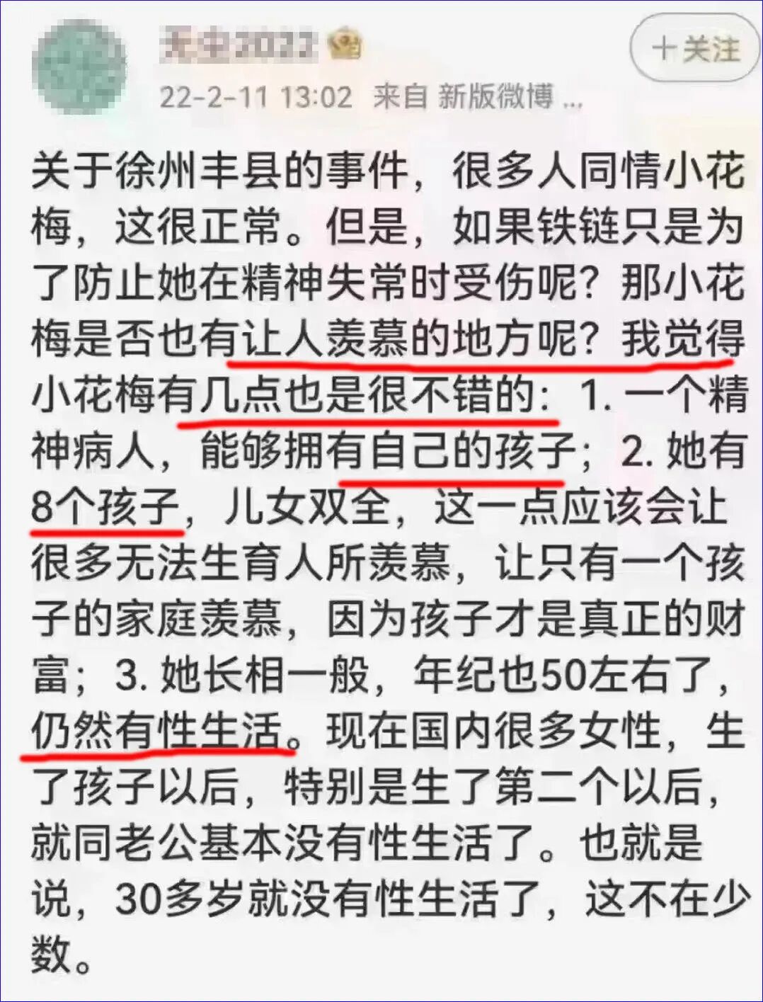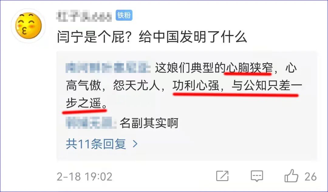 我不赞成读友的这种说法,知识分子不能因为有网络喷子就退缩,就把阵地让给喷子。但读友说的,又的确是让人有一言难尽的酸楚。这些年来,一些作家、教师,一些正直的、有影响力的人文学科学者,很多都被喷子们围攻,从网络上销声匿迹了。现在,网络喷子要准备开始围攻那些研究自然科学的学者了吗?如果颜宁是人文学科的学者,估计早就被这帮网络喷子“咬”上了。但是,颜宁是研究自然科学的,而且是在全球都享有盛誉的科学家,在主流媒体也从来没有过任何负面评价,大小喷子想咬也未必能咬得动,还得担心会不会把牙给咯崩了。而且,颜宁教授研究的结构生物学是啥,写的论文里说了啥,喷子们是看不懂的。这些年,喷子们或许不是不想咬,而是智商和学识都达不到,想咬都不知道从哪里下嘴。这次,总算是逮着个机会了。颜宁,你一个女科学家,又人在美国,为什么要关心丰县的一个女人?你有什么目的?然后就是“公知”“递刀子”“敌对势力”……一连串帽子就甩过来了。喷子的这种逻辑就是易中天老师说的“问动机不问是非”。女科学家,并非不食人间烟火啊。网上传出的视频,谁看了,只要人性未泯,都会有悲悯之心。关注这件事情,关心这个可怜的女人,这不是人本该就有的恻隐之心吗?这是人性,还需要质疑动机不纯,再扣上一顶“递刀子”的帽子吗?何况,古代读书人都知道“先天下之忧而忧,后天下之乐而乐”,今天的知识分子,更应该有“天下为公、担当道义”的情怀啊。关心民生,同情弱者,这不正是有影响力的知识分子应该坚守的人文精神吗?这些天来,我看到了很多闪光的温暖,也看到了很多的丑陋不堪。前些天我写过一篇文章,说这次事件《炸出来一群魑魅魍魉》(点击蓝字可读),但没想到,这些天还看到有更下作更无耻的。有人觉得“小花梅”很不错,让人羡慕,因为有孩子,有性。这位是不是觉得“小花梅”身在福中不知福了?我觉得你如果真这么想的话,可以主动在脖子上套个链子,然后去丰县找董某民,享受一下这种你很羡慕的生活了。还有这位,是直接把关心这起事件的热心网友给诬陷成“网络暴民”了。