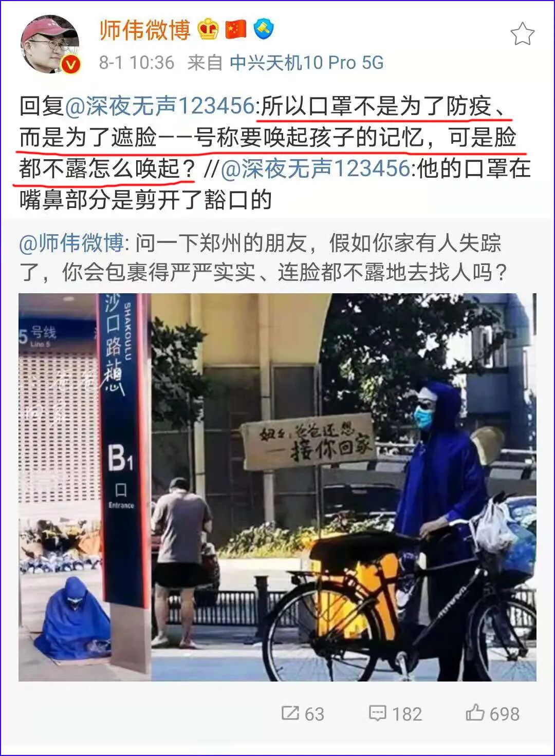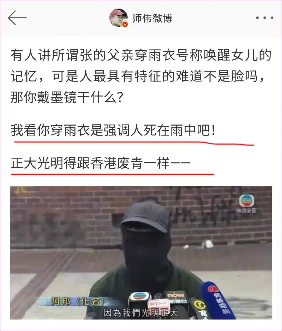 到郑州雨灾时, @师伟微博 又开始攻击“雨衣爸爸”有敌对势力的嫌疑,戴口罩不是为了防疫,而为了遮脸,穿雨衣是想要来“搞事情”。