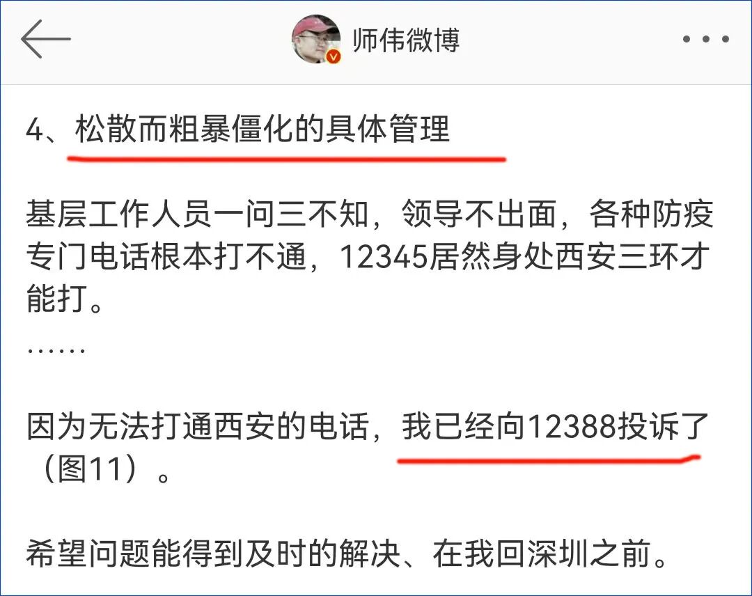 因为“领导不出面”, @师伟微博 又开始诬蔑诋毁西安是在“松散而粗暴僵化的具体管理”。