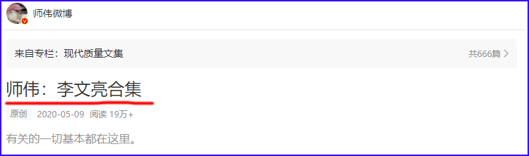 早在2020年时, @师伟微博 就对武汉的李文亮医生很是看不顺眼,写了很多文章,还弄了一个《李文亮合集》,“岂容谣棍成英雄”“再论八谣必打”“盲人瞎马李文亮”等,光看这些文章的标题,就能知道 @师伟微博 对李文亮有多恨了。