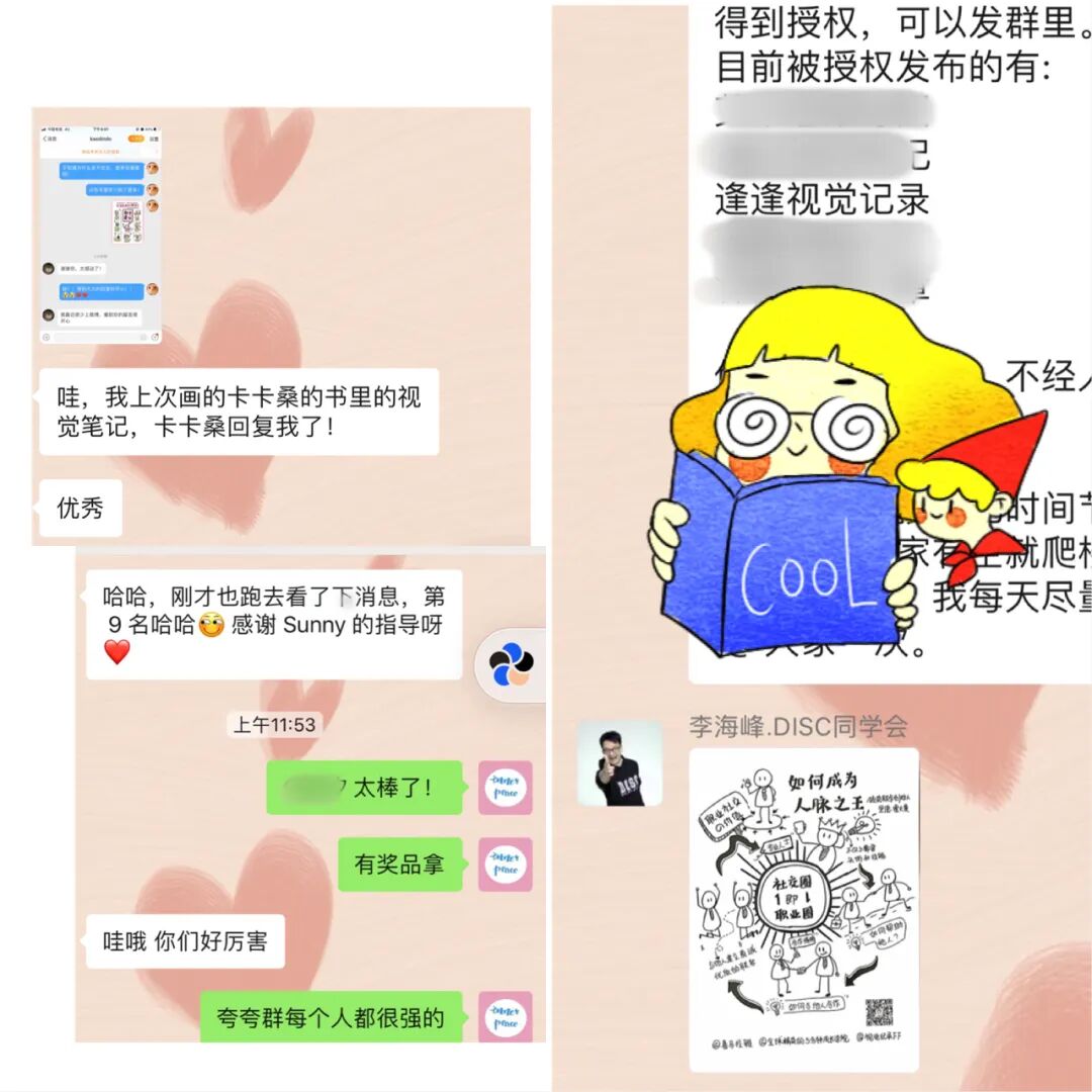 群里每天都热闹非凡,不是被点燃就是被承包笑点,还有时不时炸一波抽奖。伙伴们,大呼刺激。宝妈说,放倒神兽,一拿手机,就赶紧来群里吸收仙气。有人说大爱圈中人,有人说每天打卡视觉笔记是最快乐的时候,有人说有很多学习群,唯独这个群我不想屏蔽。