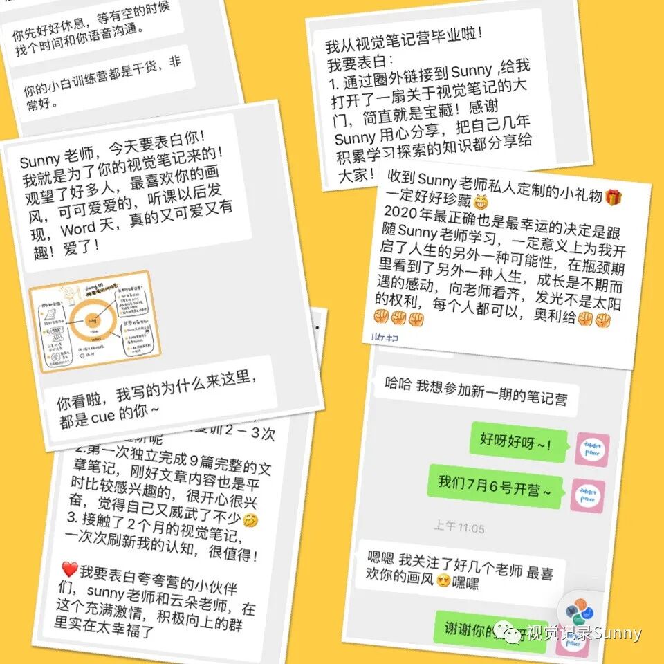 除了方法的学习,我们还有每周一次的加餐分享带你享受视觉的盛宴。互评活动,带你用全新的角度去学习视觉笔记,拆解鉴赏作品。活泼可爱的助教云朵,负责维护群秩序喝催作业,每天的小皮鞭,督促你进步。点评官实时给你的作业进行反馈,导师随时答疑。