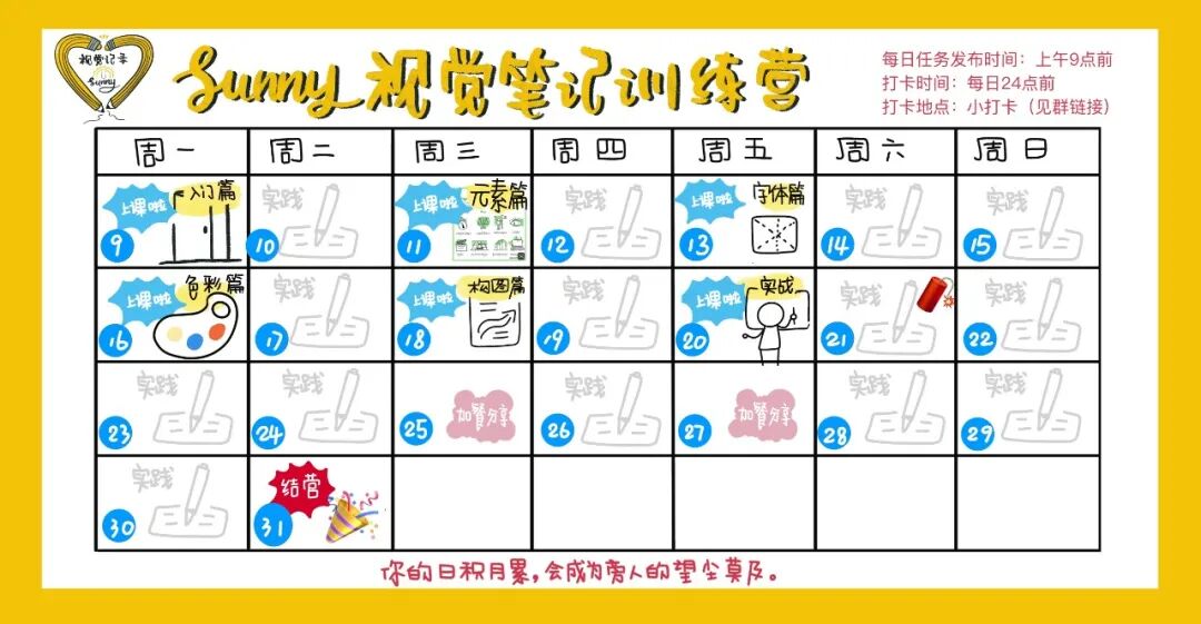 视觉笔记是实操性很强的技能,除了上课,每天都有练笔任务。当然,按时完成20次作业,总费用499元,可以返还99元。加微信(sunny432)