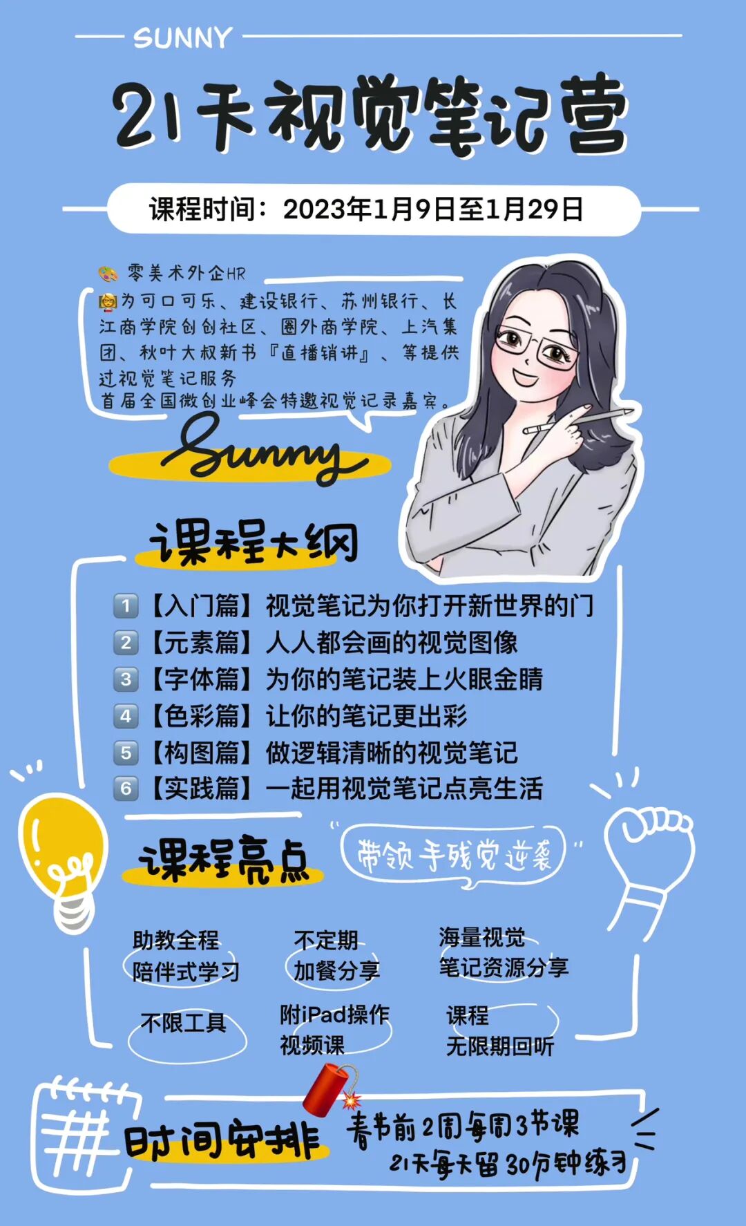 如果你喜欢以上任一图文风格,欢迎私信Sunny链接上述伙伴。如果你也想解锁以上技能,欢迎你来Sunny的视觉笔记训练营!这里有全职宝妈、学生党、有各学科老师、有会计、医生、有编辑、保险顾问、有数据分析师、IT从业者,有HR、有社工、还有公务员......等等等等。不管是想get一项新技能的零基础小白、想要结交共同爱好的朋友,还是想和孩子建立更多链接的宝爸宝妈...只要你想,只要你愿意迈出第一步,这里都适合你。帮你更有效梳理并输出阅读的书籍信息以及课堂的听课内容,高效动用左右脑;它会帮助你成为职场中不可或缺的角色;让孩子对你刮目相看,并且树立良好的学习榜样,身教大过于言传;
