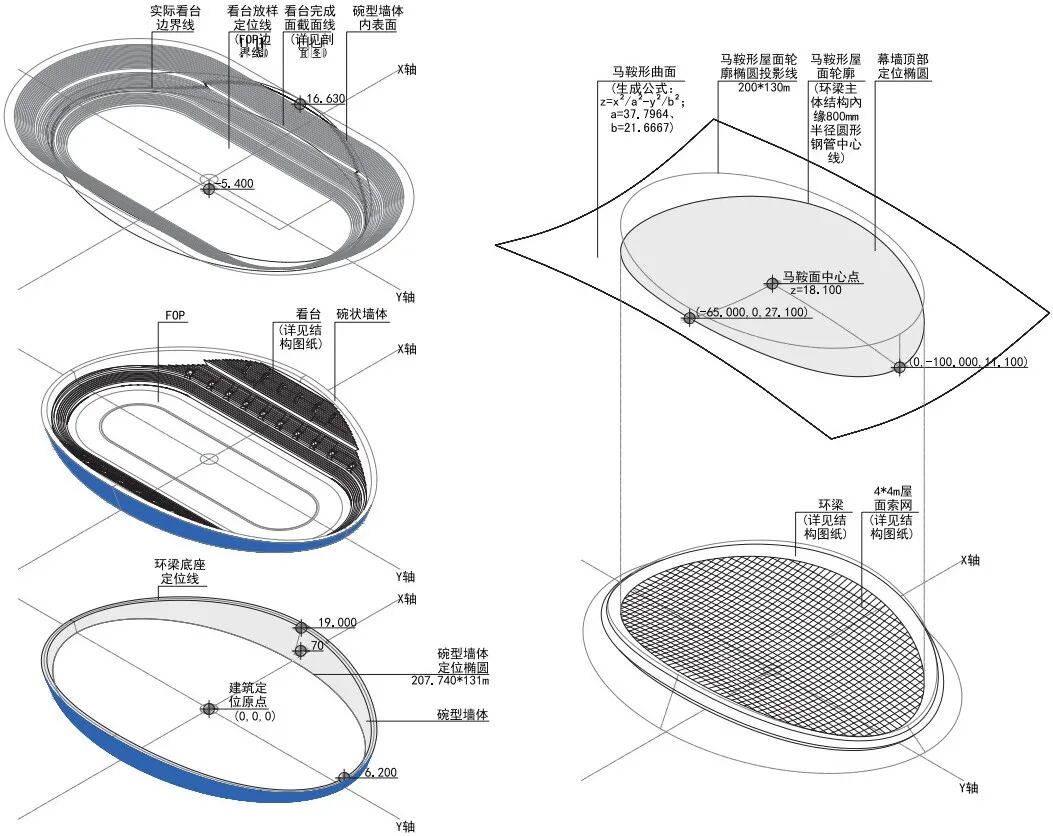 第一个特征是概念性的双曲面马鞍形屋顶。其用于控制冰场内部巨大空间的容积,最大限度地减少空调、除湿的负荷。这样一个曲面,同时也是索网结构张拉受力的有效形状,索网结构高度约0.2 m,能够极大地节省结构本身所占的空间。
