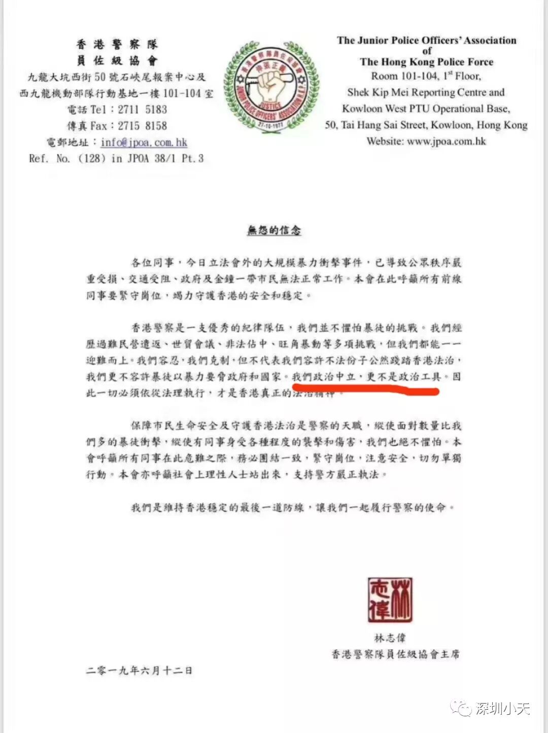 当港警连自己的妻儿老小生命安全都受到迫害时,他们还能不能再组成人墙守卫身后的秩序?当武装力量都害怕时,什么最危险?在特首之后,警察协会赶紧声明“政治中立”。