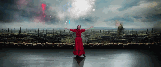 更高明的是,导演通过舞台上珠儿忘情沉浸在自己的舞蹈世界,近而脑中投射出一群军装舞伴和炮弹烟花的视听场景,隐喻了剧作的反战思想——