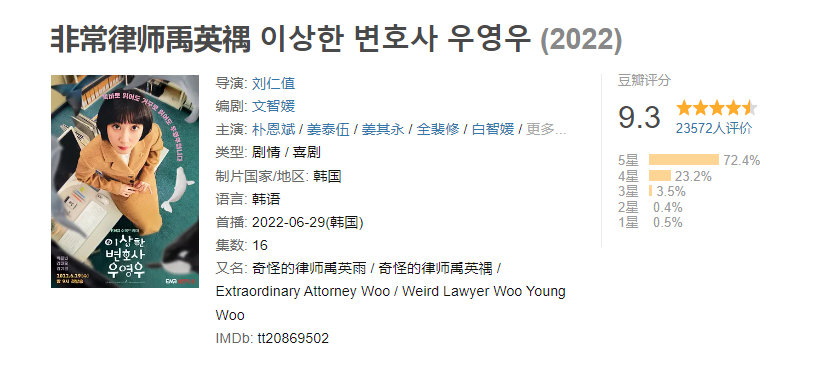 继9.1分的《我的解放日志》之后,最近又有一部韩剧成为口碑黑马:网飞与ena共同打造的《非常律师禹英禑》(《奇怪的律师禹英雨》),收视就一路往上升,而且豆瓣评分飙上9.3!