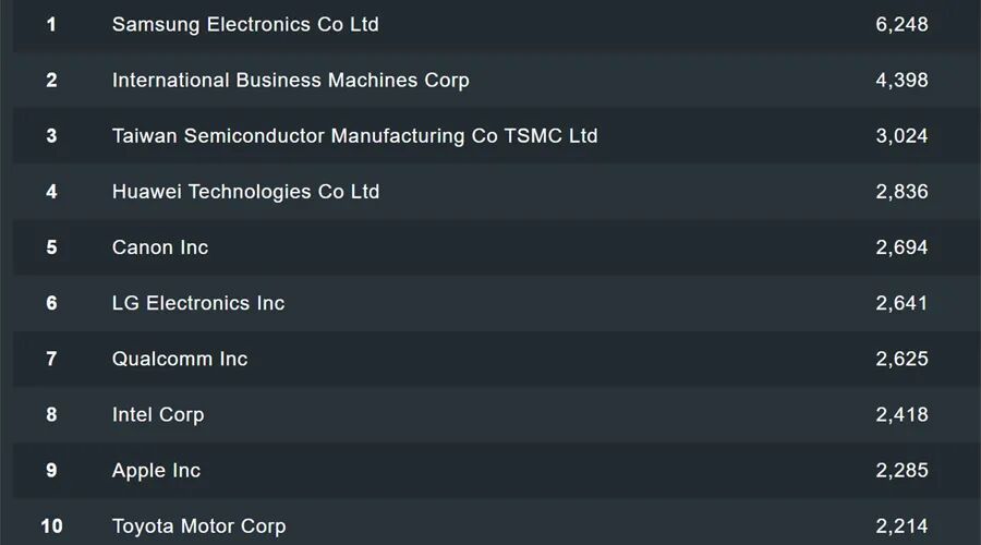 美国商业专利数据库(IFI Claims)发布2022年度美国专利授权量50强名单。三星电子在2022年获得了6248项专利,排名第一,超过了IBM公司的4398项。台积电上升至第三位,获得了3024项专利。华为升至第四位,获得了2836项专利。中国的京东方和OPPO也进入榜单。