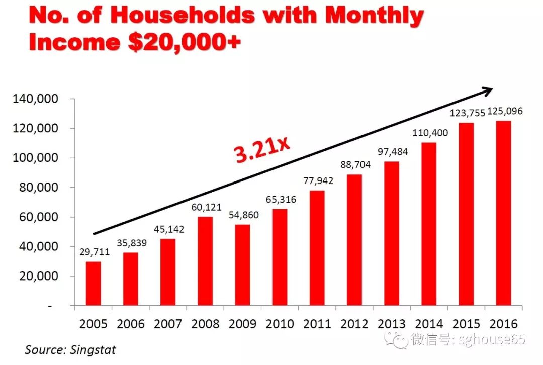 从人均收入来看,各个阶层的家庭收入都有所增长,其中中高薪阶层在2005年月收入2万新币以上的家庭,到了2016年家庭收入可达12万多新币,平均增幅达3.2倍或以上