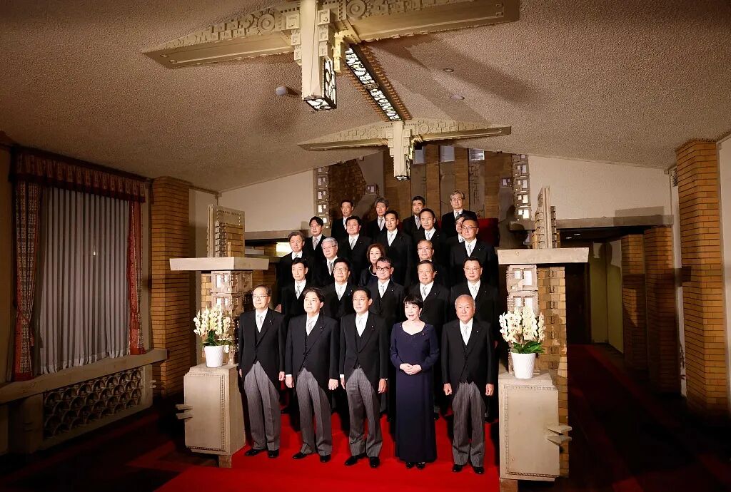 8月10日,日本首相岸田文雄(前中)和内阁大臣们在首相官邸拍照留影。图源:GJ