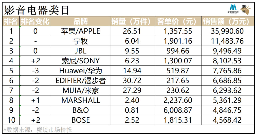 在影音电器类目,苹果稳居第1,宁牧顶替华为位列第2,JBL维持第3。