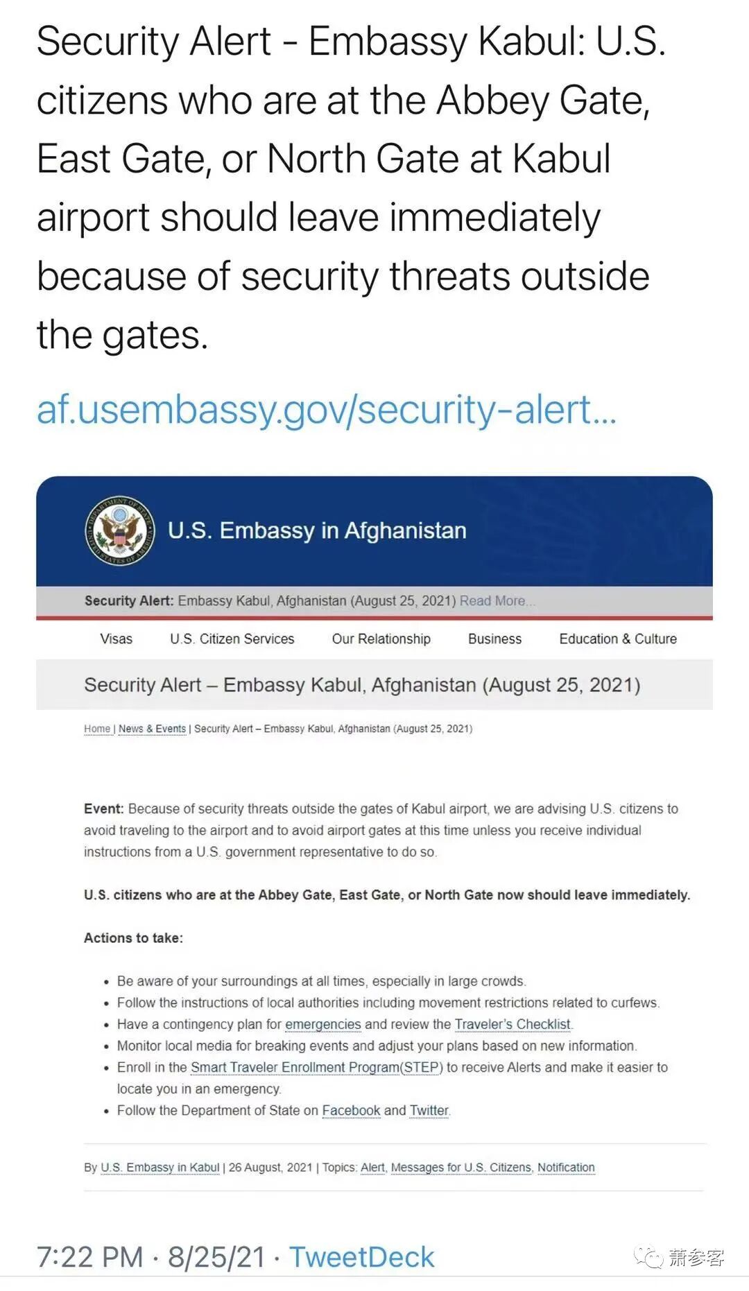 看看上面今天的警报,关闭的大使馆只发这样的文字,有用吗?美国公民怎样离开?如何离开?哪里安全?谁保护他们离开?由此足见拜登政府的无能与混乱的撤离方式!