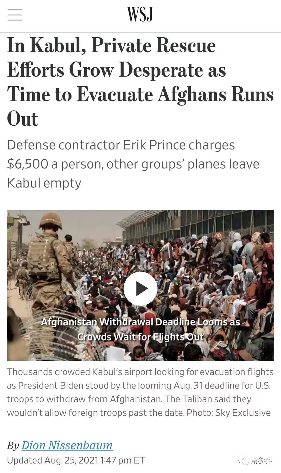 华尔街时报(WSJ)今天的报道:在喀布尔,由于疏散阿富汗人的时间已经不多了,私人救援工作变得非常绝望!