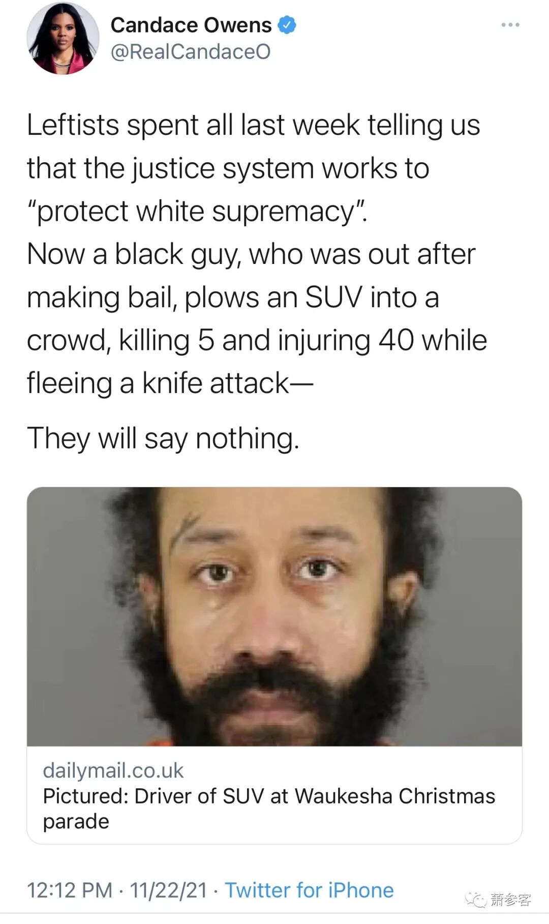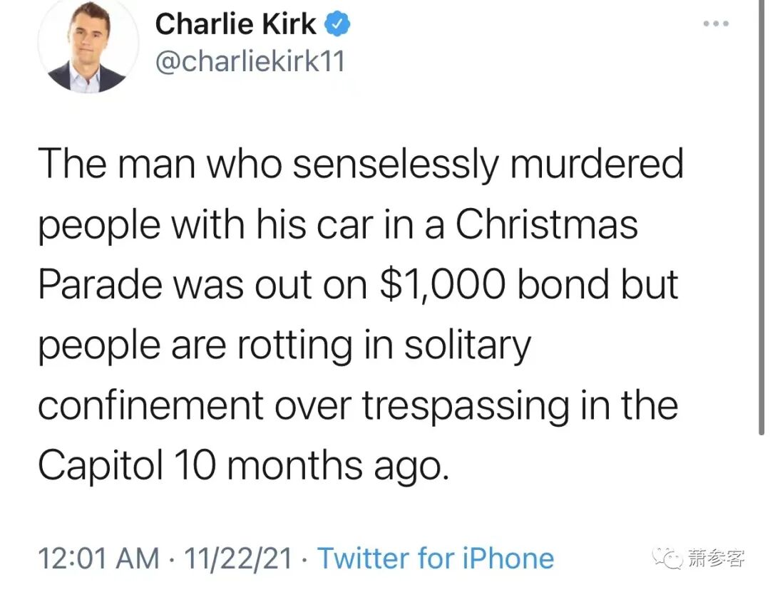柯克的推特:在圣诞游行中用汽车肆意杀人的凶手以1000美元的保释金出狱,但人们却因10个月前闯入国会大厦而被单独监禁至今。
